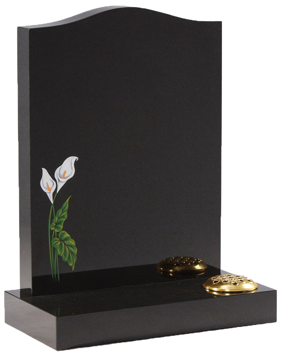 Highly Polished Black Granite Headstone with coloured sandblasted Lily design to bottom left.