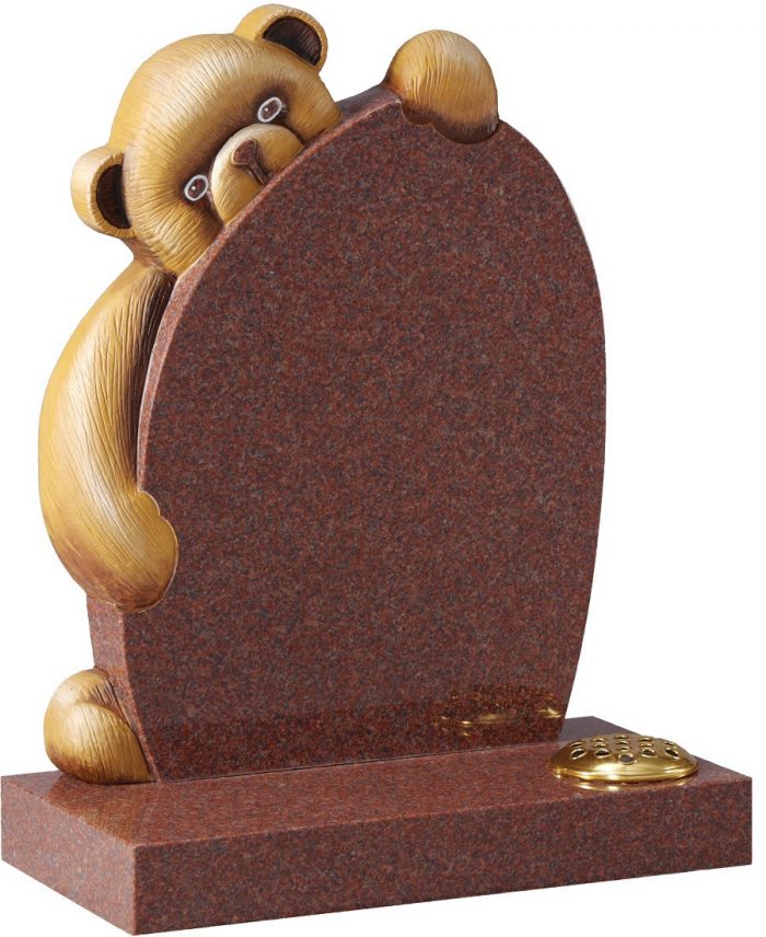 This Polished Imperial Red Granite Child’s Memorial has a carved teddy cuddling the inscription area.